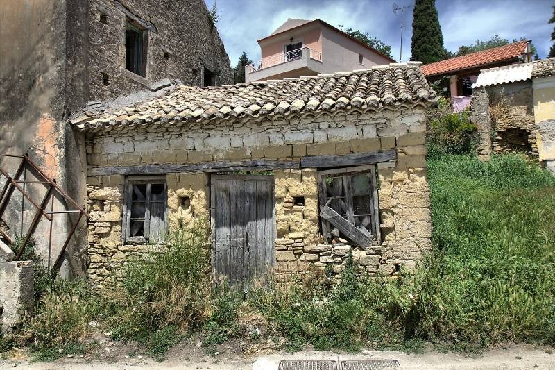 In het dorpje Peroulades stappen we weer op de bus. Als je van verwaarloosde huizen, oude deuren enz houdt kun je hier je hart ophalen...