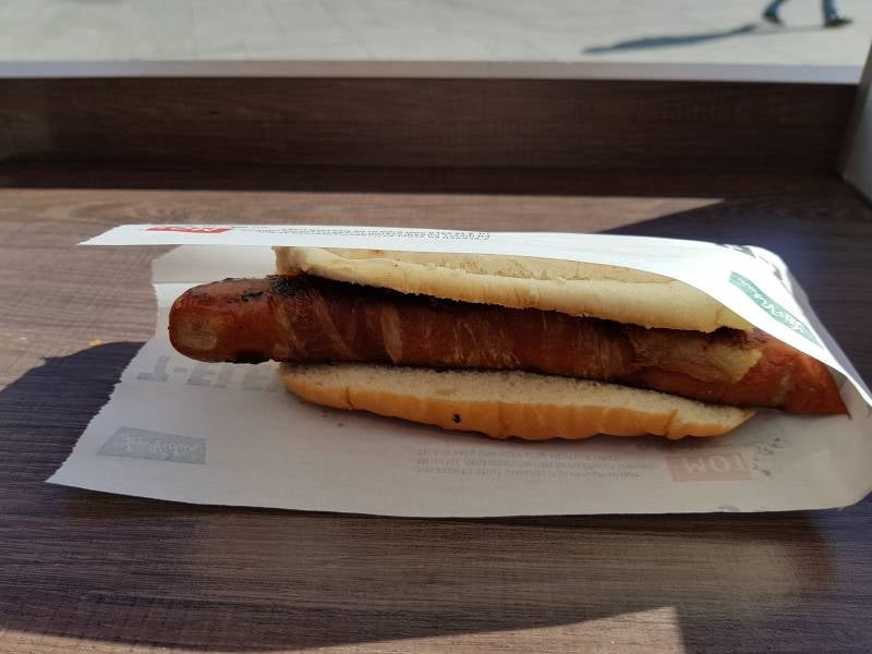 Het diner bestaat uit een broodje met een in bacon gebakken worstje (er zit ook nog kaas in) Erg lekker en betaalbaar, dat is ook niet onbelangrijk hier!